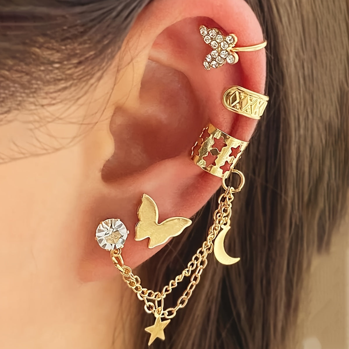 4pcs Star Moon Butterfly Ear Cuffs Set Trendy Golden Tassel Rhinestone Ear Clips Golden Stainless Steel Earrings For Women Girls