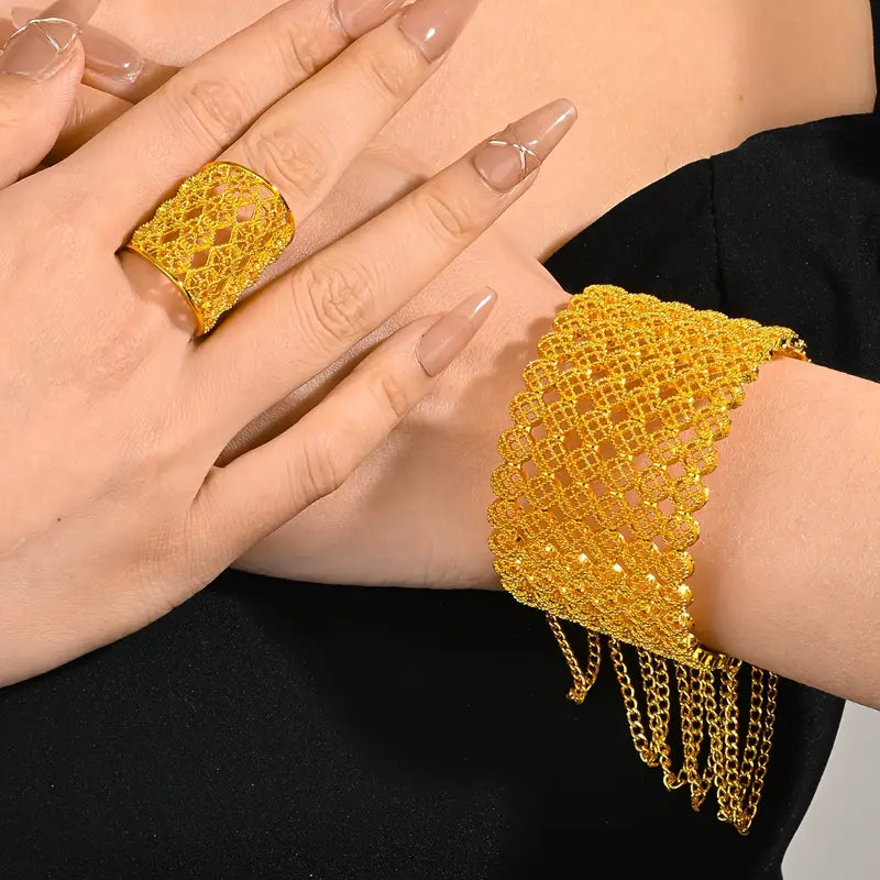 Vintage Luxury 18K Golden Plated Wide Cuff Bracelet and Ring Set, Middle Eastern Filigree Bridal Wedding Banquet Jewelry, Hollow Zinc Alloy Open Bangle without Stones for All Seasons